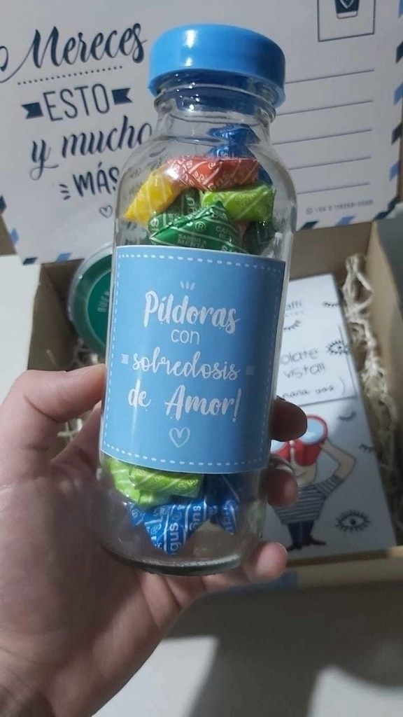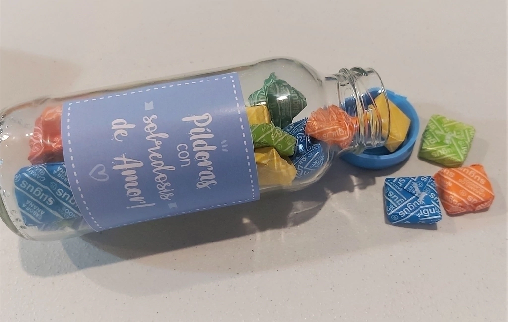 Contiene 35 caramelos Sugus y sticker "Pildoras con sobredosis de amor" con color a elección!